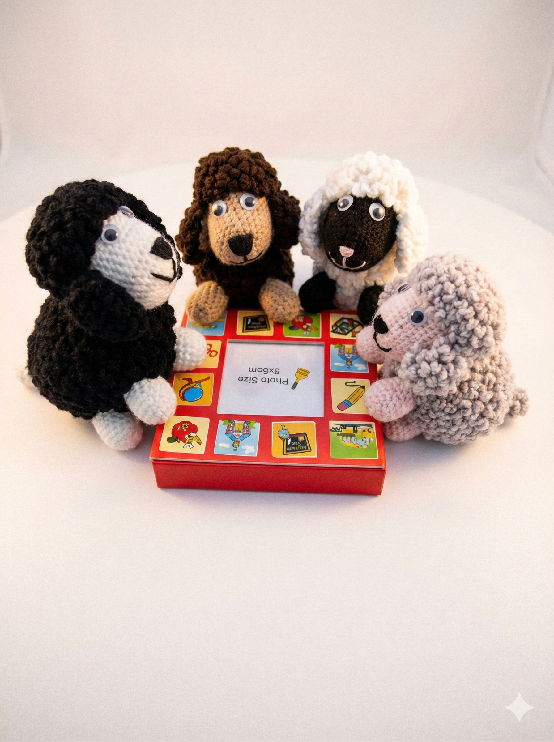 A delightful flock of four! This set features four handheld sheep in varying natural tones—white, black, brown, and grey. Crocheted with a special textured stitch to mimic real wool, they are perfect for farm-themed nurseries or educational play.